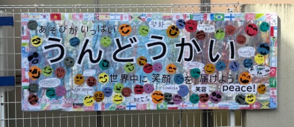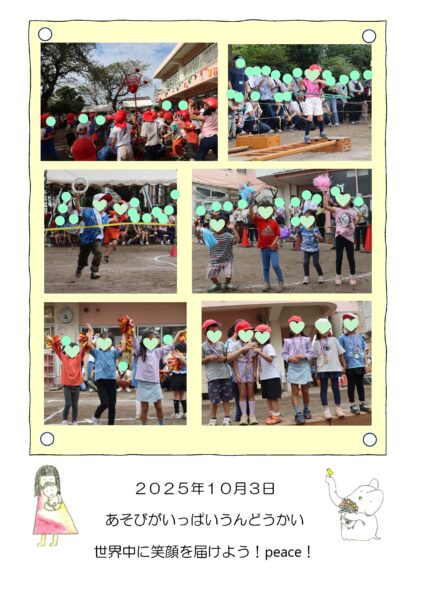 今年は、テーマを「世界中に笑顔を届けよう!peace!」といたしました。世界には戦争や飢餓のために笑顔が失われている子どもたちがいます。そのことを知った年長組の子どもたちが7月に世界中に笑顔を届けるためにコンサートをしました。運動会でも、その思いを継続するために決めたテーマです。多様なお互いの違いを認め合い、力を合わせて平和をつくり出していけるようにと願っています。